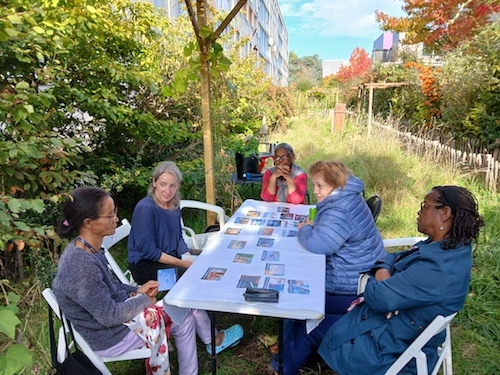 Après quelques récoltes de tomates cerises, haricots verts et betteraves, 9 personnes (7 adultes et 2 ados, la photo ci-dessus a été prise juste après le départ de la petite famille de 4…) ont participé à un atelier sur le dérèglement climatique. A l’aide de cartes de deux ateliers de sensibilisation sur ce sujet – la “Fresque du climat” et “Inventons nos vies bas carbone” – nous avons pu décortiquer le mécanisme du dérèglement, ses causes et ses conséquences, puis discuter de notions telles que “effet de serre”, “empreinte carbone”, “météo vs. climat”, “impacts et ordres de grandeur”…
